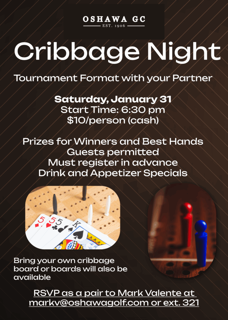 Cribbage Night Click here to sign up! + Add to Google Calendar + iCal / Outlook export 00 days 00 hours 00 minutes 00 seconds Date Jan 31 2026 Time 6:30 pm - 10:00 pm Share this event